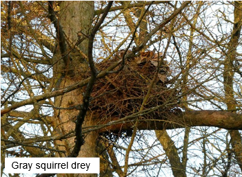 Another adaptation that helps gray squirrels to survive the winter is their well-built homes. Squirrels prefer to spend the winter in tree cavities or other protected places. However, with steep real estate competition from other animals, such as raccoons and woodpeckers, squirrels have to turn to construction. Squirrel nests, called dreys, are easy to spot once the trees lose their foliage. What looks like a big clump of dead leaves balances 20 to 30 feet in the air, usually near the trunk of the tree or at the intersection of larger, stable branches. Each drey is a carefully woven structure of sticks and bark, lined inside with moss, pine needles, dried grass, feathers, and shredded bark. They typically have only one entrance and are 1 to 2 feet in diameter. Of course, when faced with a tough housing market, the best thing to do is get some roommates. Gray squirrels overwintering in dreys often share their nests with one or more other squirrels for warmth.